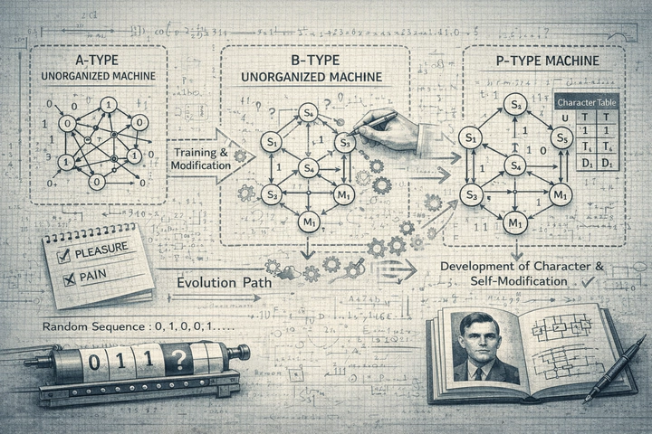 Image generated from GPTI recently revisited a very old paper by Alan Turing: Intelligent Machinery, written in 1948. In this paper, Turing discusses the initial idea of AI: how to model AI, and how to train AI. Even though it is a very old paper and the words are kinds of obscure to me, it is still worth reading the whole paper in detail. In this blog post, I will interprete some interesting ideas in the paper, and hopefully it also inspire broader audience as well.